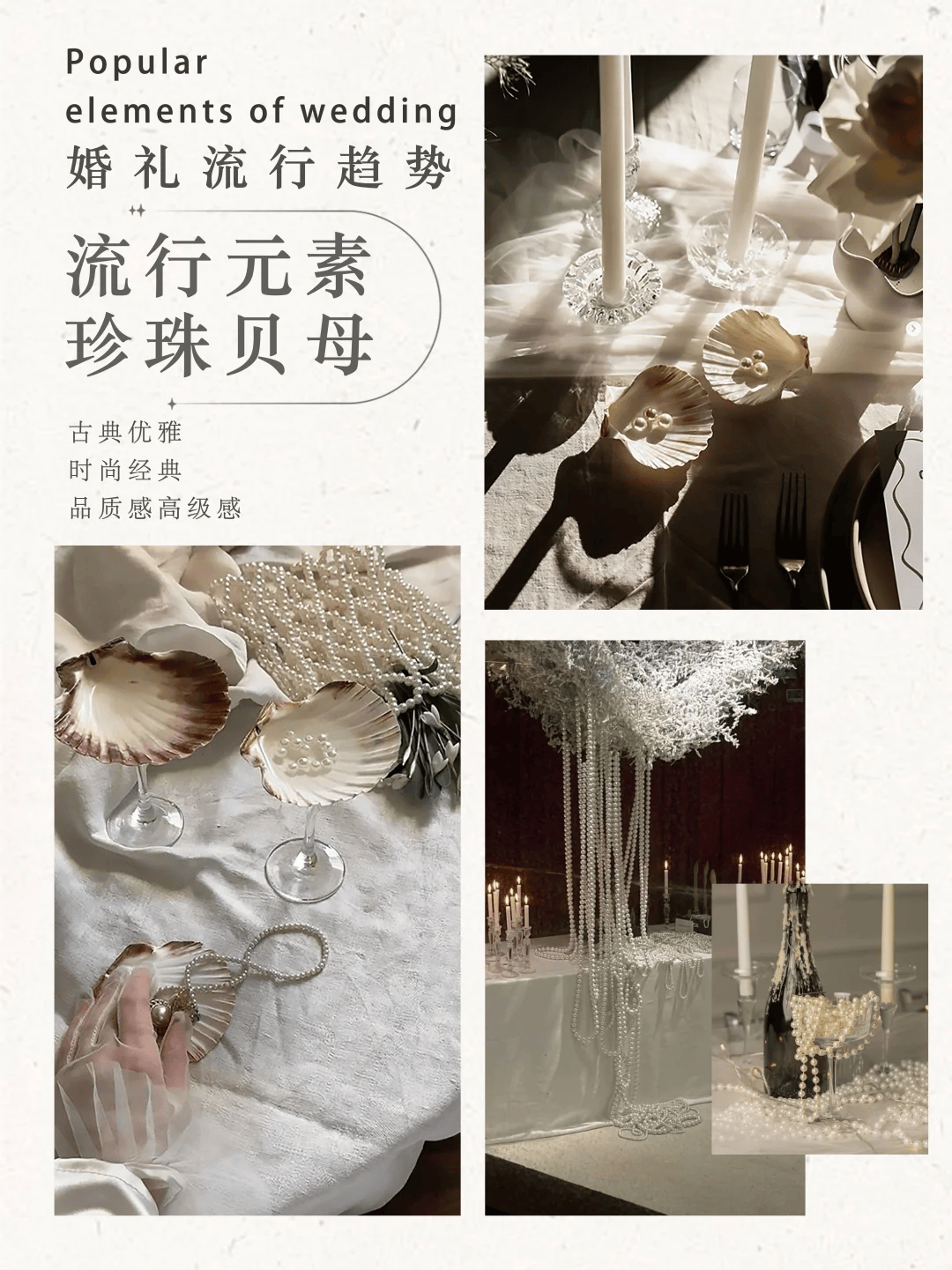 珍珠贝母的温润光泽,无论是用在婚纱、饰品还是桌面装饰上,都能提升整体质感,让婚礼显得精致又高级。