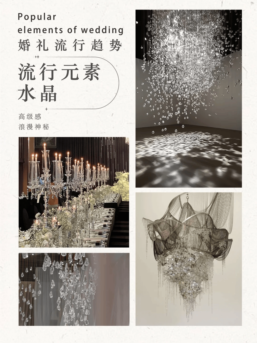 水晶的剔透质感,在灯光下折射出绚丽光芒,能为婚礼增添华丽氛围,适合喜欢轻奢或复古风格的新人。