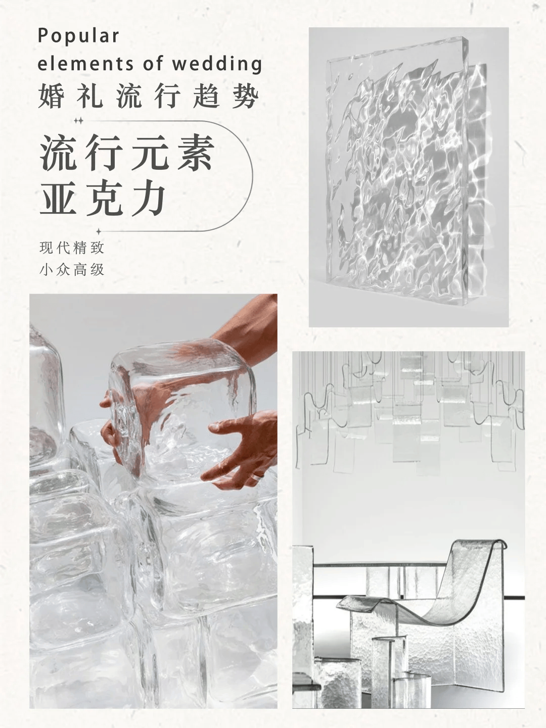 亚克力材质通透轻便,颜色也多样,做成桌牌、路引或者背景装饰都很合适。它不厚重,还能透出光线,让婚礼现场显得干净又现代,很适合喜欢简约清爽风格的新人。