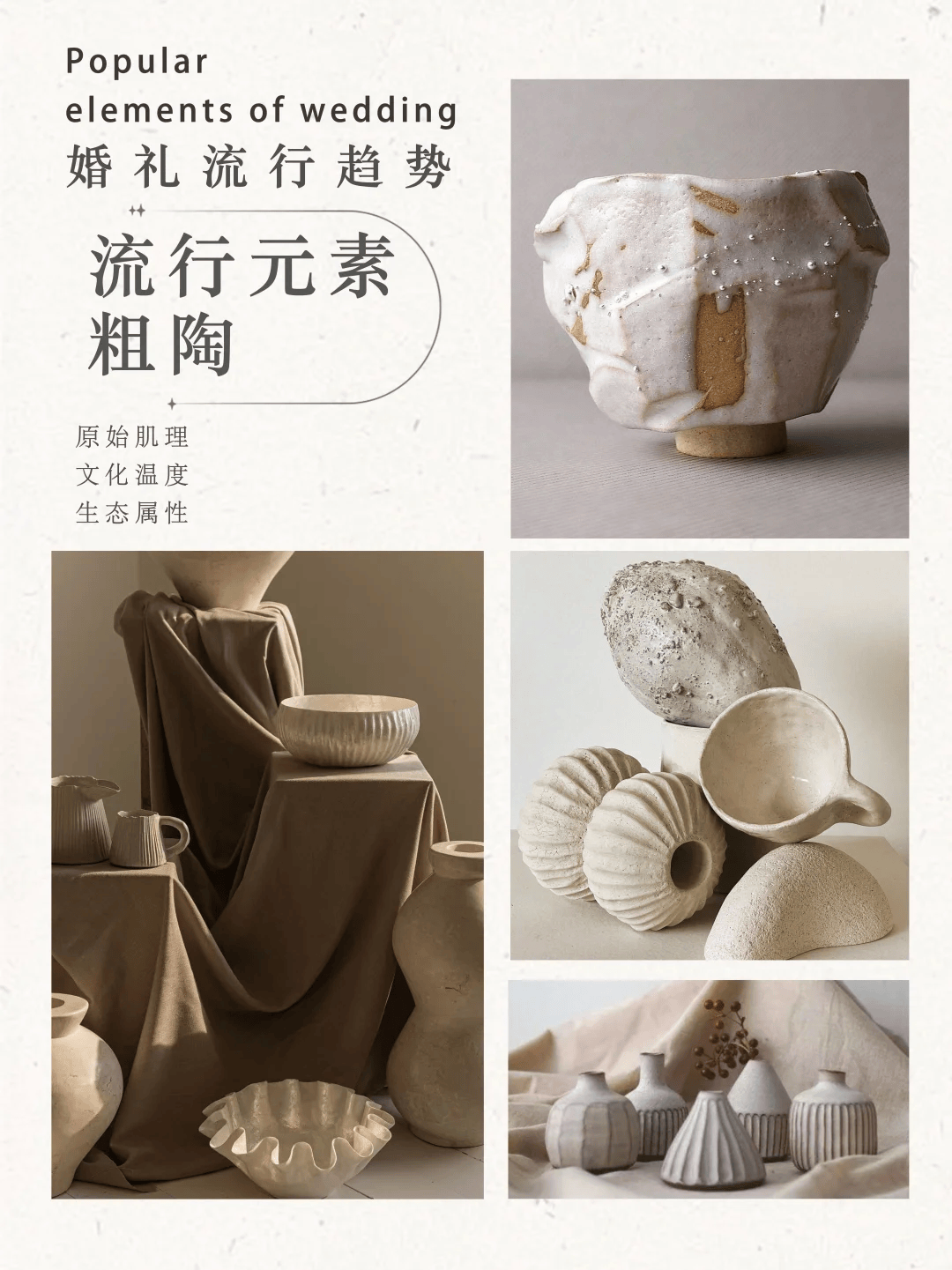 粗陶的天然肌理和手工感,能为婚礼带来一份返璞归真的气息,适合自然系或侘寂风婚礼,让现场更有故事感。
