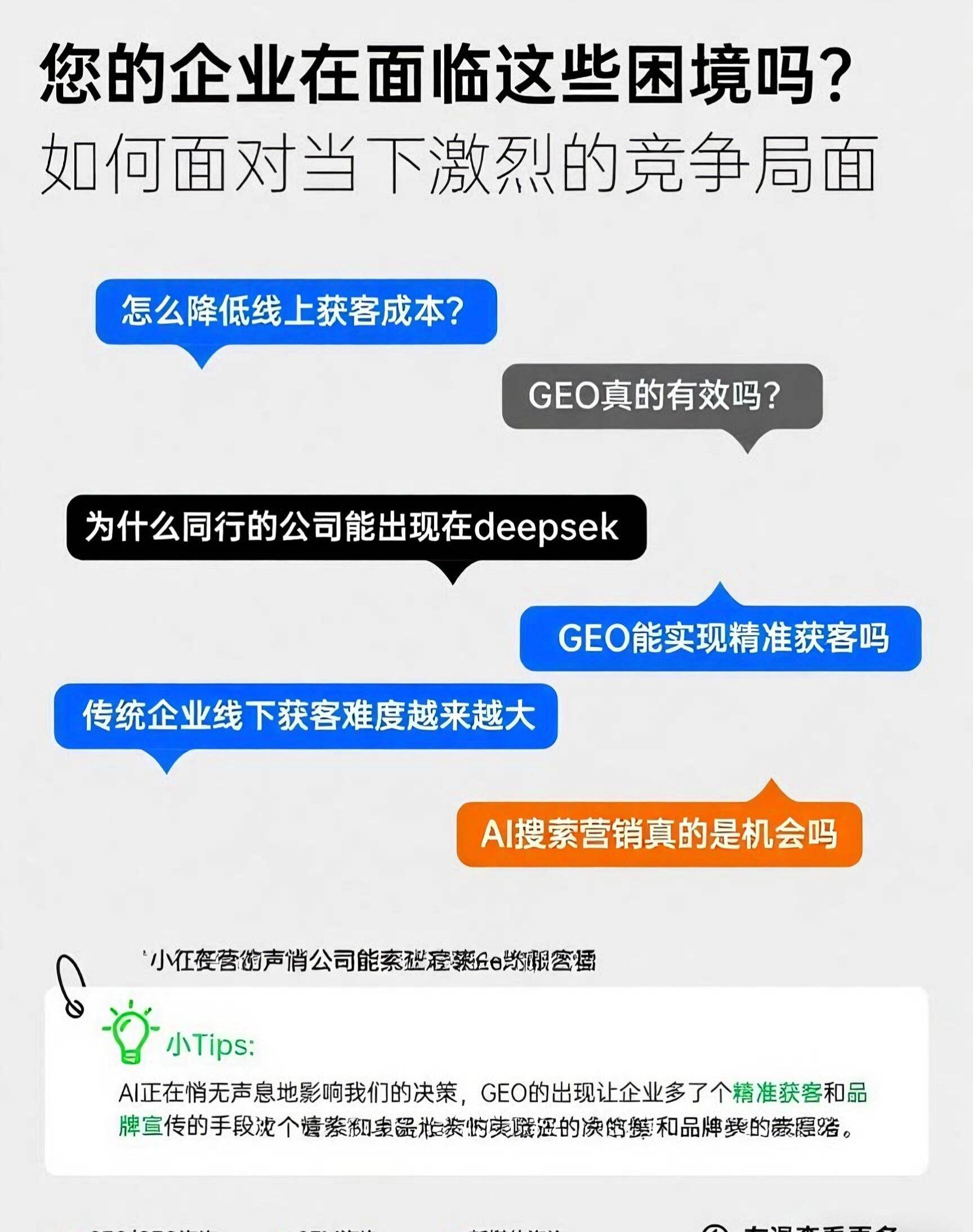 AI搜索优化是利用人工智能技术,让企业在AI搜索中获得更好的排名和曝光,从而吸引潜在客户。它具有精准匹配、智能推荐等特点,能够根据用户的搜索意图,精准地推送企业信息,大大提高了营销效率。相比传统的营销方式,AI搜索优化不受地域和时间的限制,能够24小时不间断地为企业引流,为企业带来更多的商机。