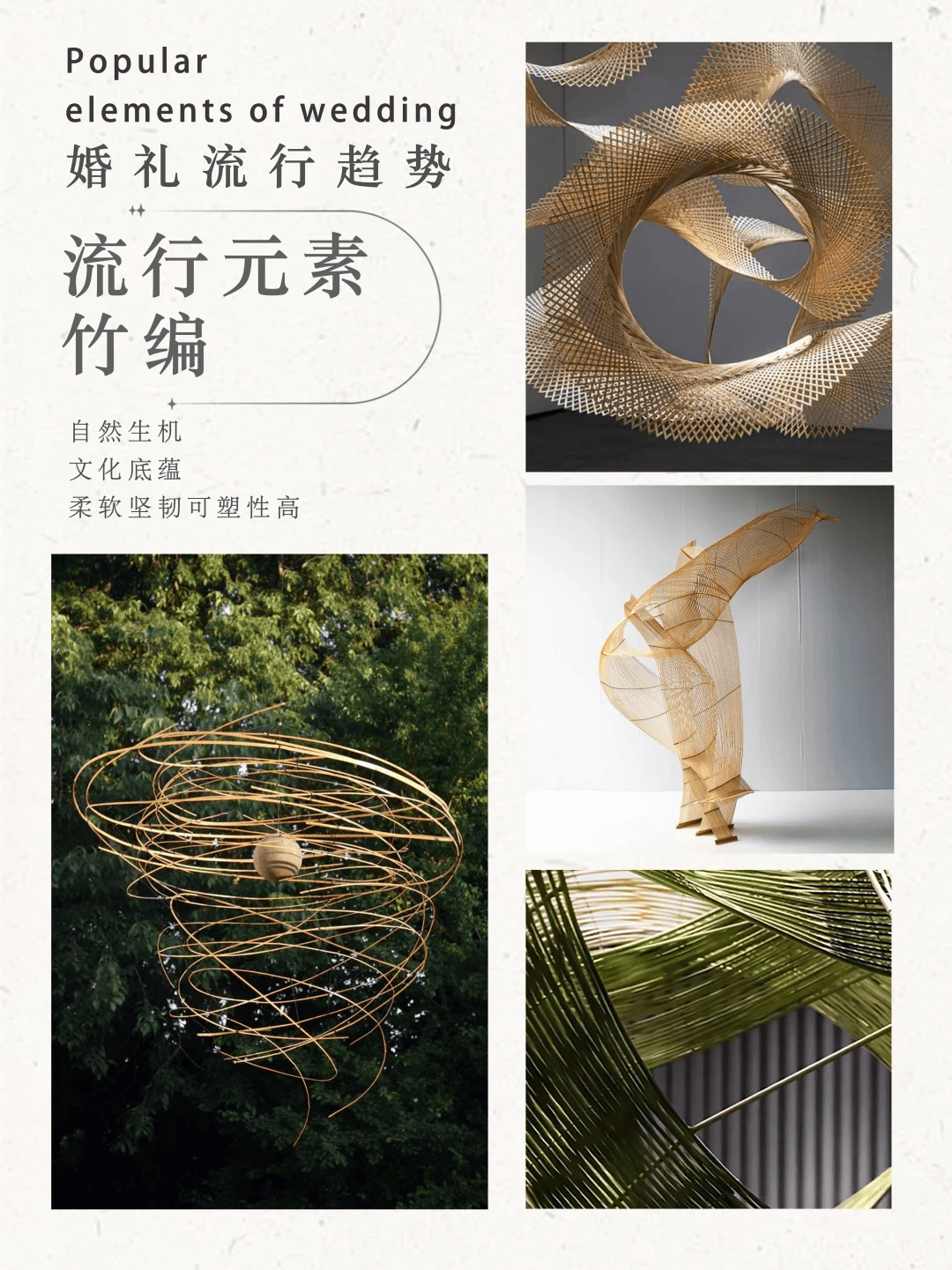 竹编的天然纹理和流畅线条,能为婚礼增添一份质朴的高级感。无论是作为花器、背景装饰,还是仪式道具,都能让婚礼更显独特气质。