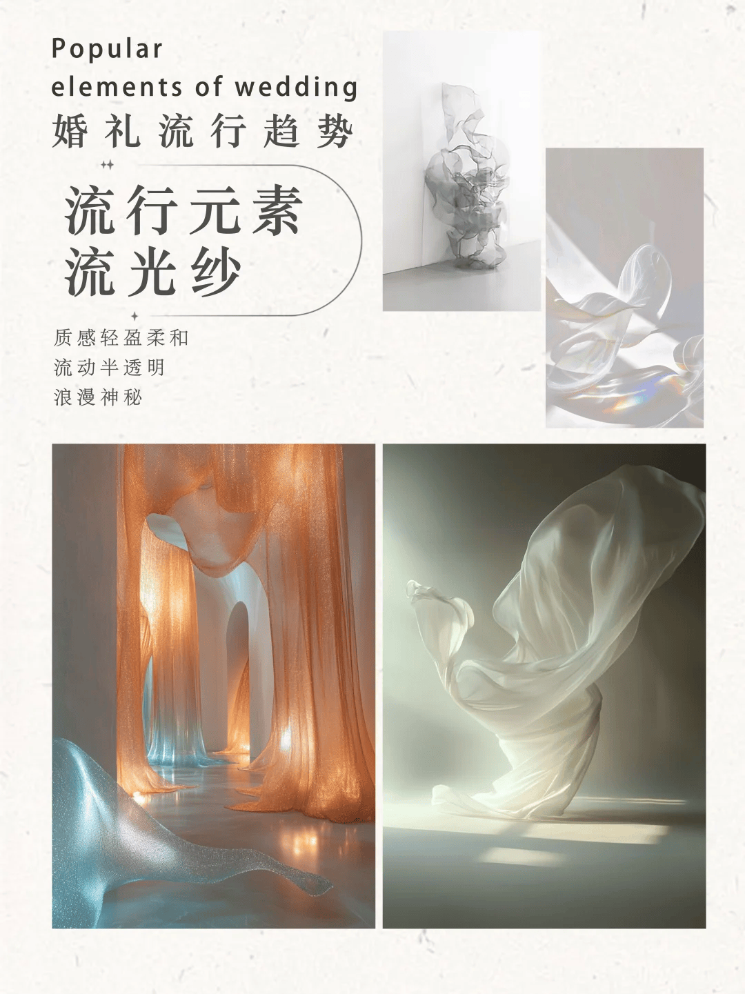 半透明的流光纱轻盈飘逸,能轻松打造出朦胧梦幻的效果,特别适合森系、星空或童话主题的婚礼。