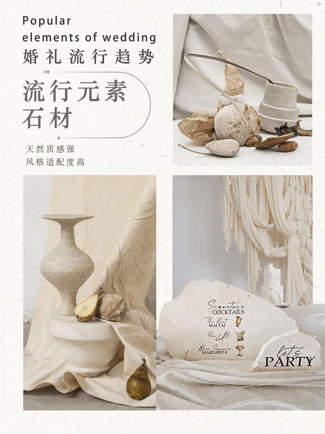 带点粗犷感的岩石,不管是大块的作为背景点缀,还是小块的当桌花底座,都能带来一种贴近自然的原始气息。搭配绿植或鲜花,能让婚礼多一份沉稳的质感,适合户外或自然风婚礼。